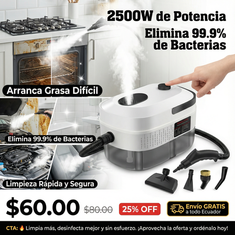 La Limpiadora a Vapor de Alta Presión 2500W elimina la grasa, suciedad y bacterias con vapor a alta temperatura, sin esfuerzo y en menos tiempo 🕒✨.